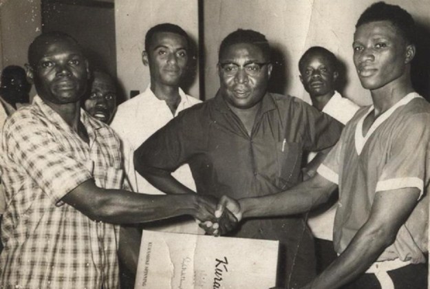 Ali Kitonsa (RIP) receiving a prize for scoring 54 goals in 18 games during the 1964 Kampala District Football Association league. | Courtesy photo
