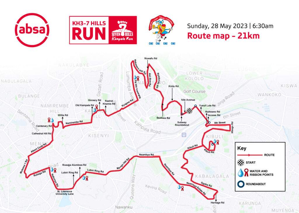 The 21km race will kick off at Kingdom Kampala, Nakasero through Nile Avenue to Kyadondo Road, onto Nakasero Hill Road and then down to Kyaggwe Road, Namirembe Road, Albert Cook Road to Rubaga Road.