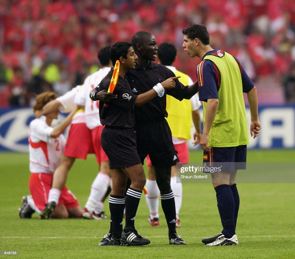 Albert Luque of Spain argues with Assistant Referees Ali Tomusange and Michael Ragoonath after the FIFA World Cup Finals 2002 Quarter Finals match between Spain and South Korea played at the Gwangju World Cup Stadium, in Gwangju, South Korea on June 22, 2002. The match ended in a 0-0 draw after extra-time, with South Korea winning on penalties 5-3. DIGITAL IMAGE. (Photo by Shaun Botterill/Getty Images)
