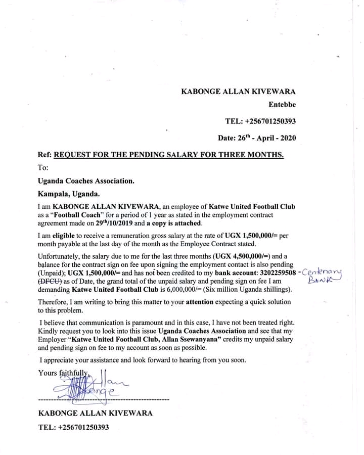The letter submitted to the Uganda Football Coaches Association by Allan Kabonge.