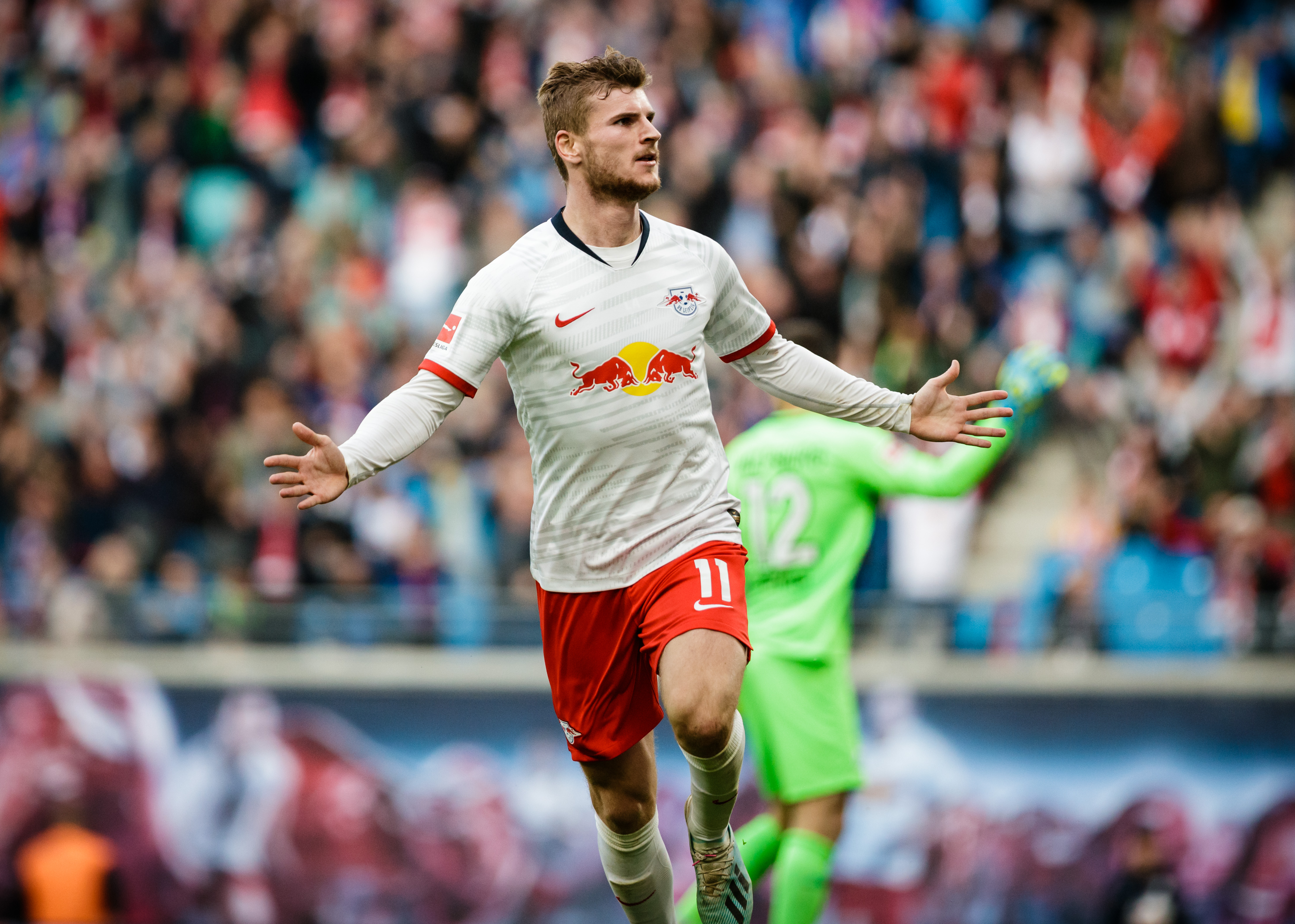 Timo Werner of RB Leipzig celebrates his goal during the Bundesliga match between RB Leipzig and VfL Wolfsburg at Red Bull Arena on October 19, 2019 in Leipzig, Germany. [Photo by Reinaldo Coddou H./Bundesliga/Bundesliga Collection via Getty Images]