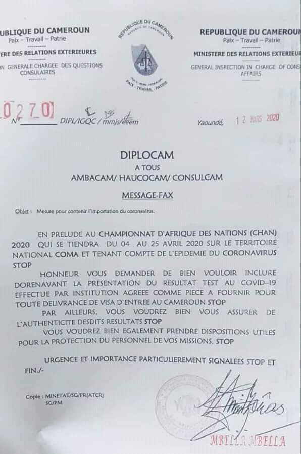 The minister of foreign affairs Mr. Lejeune Mbella Mbella has issued a fax-message to all foreign embassies asking all Cameroonian embassies overseas to include test outcomes of the COVID-19 as one of the visa requirements.