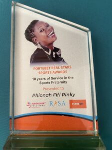 At event, the awarding ceremony started with Jude Colour solutions awarding outstanding journalist Fifi Phiona Pinky for the work she has done over her 10 years in the Uganda sporting world.