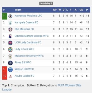 The record Champions are now back up top of the log with 18 points, 2 above defending champion Kampala Queens who have a game in hand.
