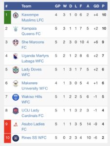 With a game in hand, Ayub Khalifa’s army of Kawempe Muslim now occupy top spot ahead of the Kampala Queens, level on points (10) but with a better goal difference of 4 goals on 2.