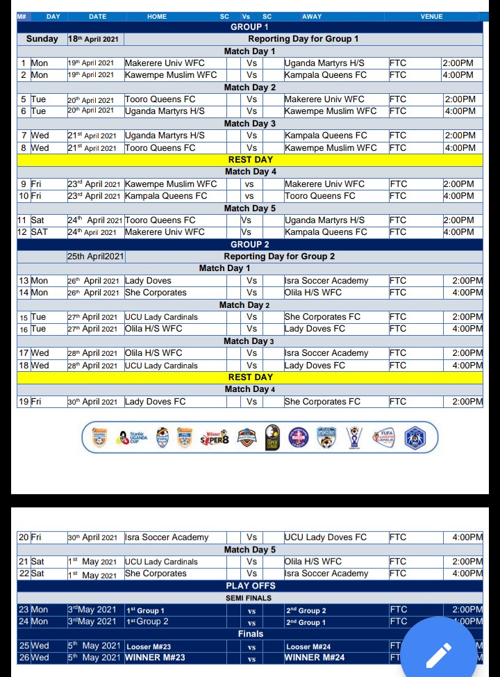 Group one consists of Kawempe Muslim WFC, Kampala Queens WFC, Uganda Martyrs H/S, Tooro Queens and Makerere University WFC while group two has Lady Doves, UCU Lady Cardinals, She Corporates, ISRA soccer academy and Olila H/S WFC.