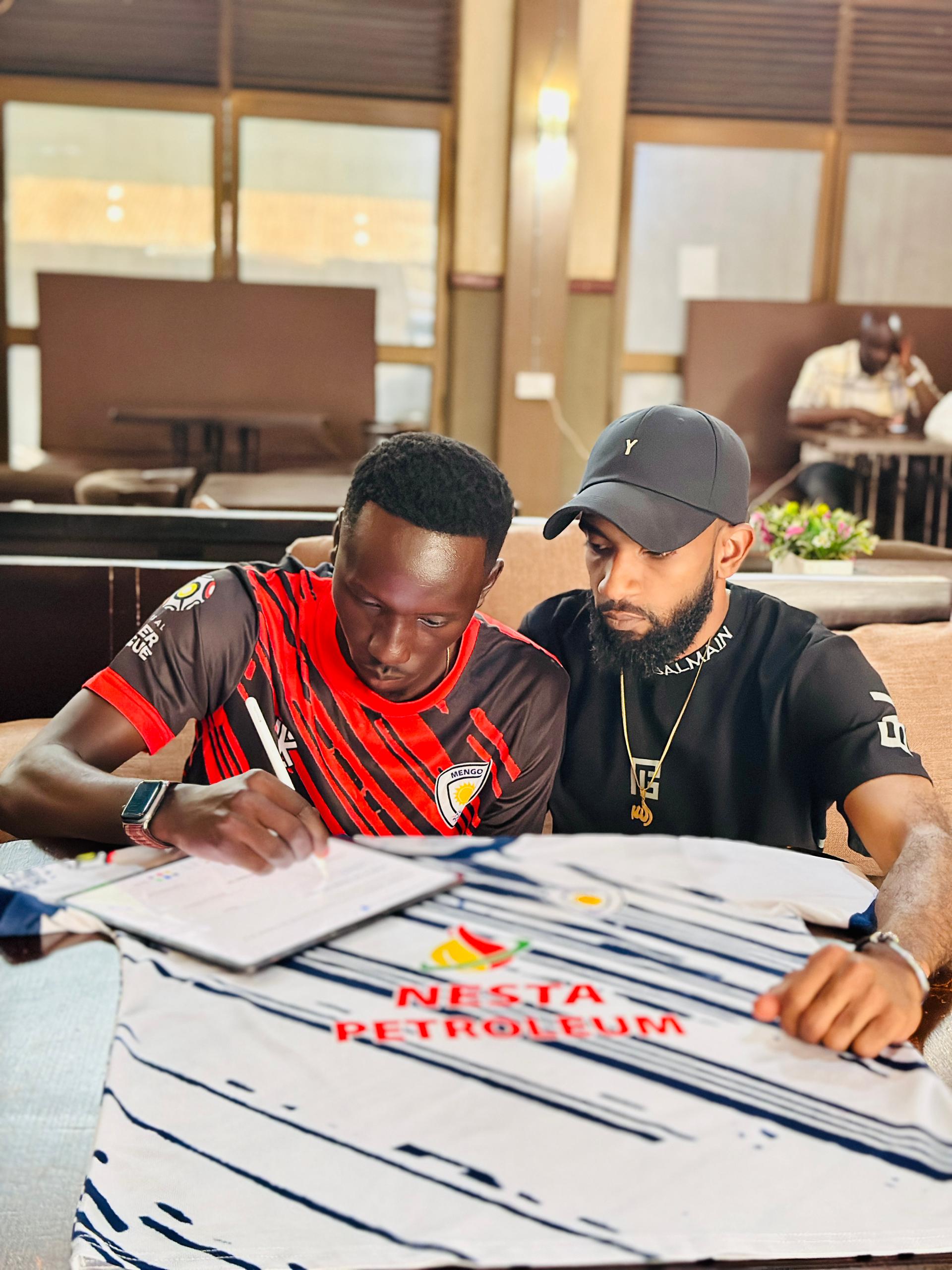 Aziku putting pen to paper in presence of Mengo City CEO Lakhan