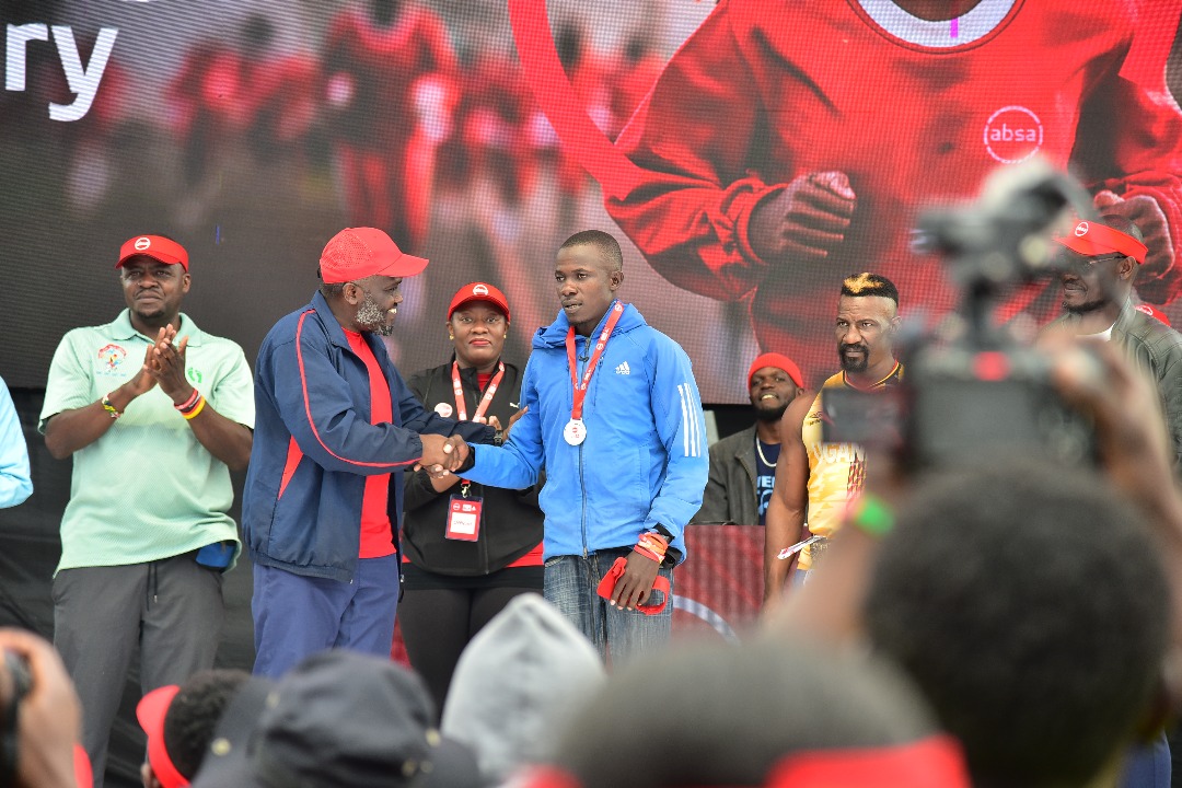 Absa Interim MD, David Wandera gives a congratulatory handshake to 2025 KH3- 7 Hills Marathon gold medalist Brian Ategeka