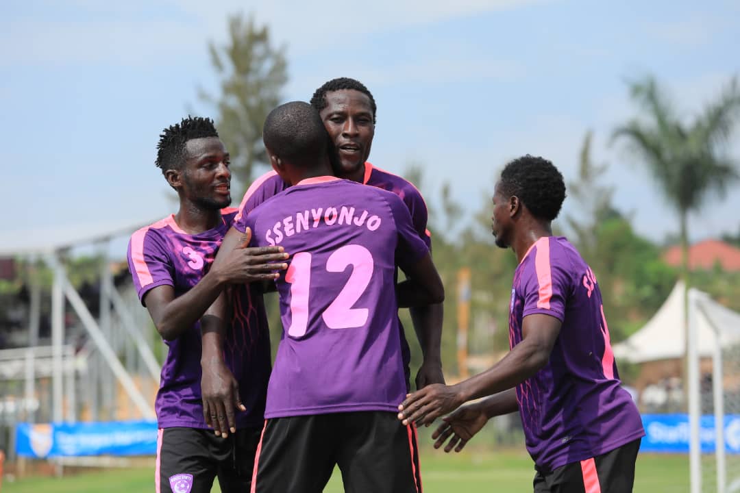 Geoffrey Sserunkuma is congratulated by teammates after scoring his first of the season | Courtesy of Sanyuka TV