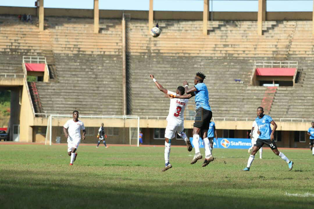 Fahad Bayo rises above Kyetume FC’s Steven Sande to score the opener during the first round encounter at the Mandela National Stadium | Courtesy photo