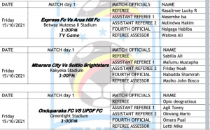 The last game on Friday( Onduparaka Vs UPDF FC at the Greenlight Stadium, Arua) will be officiated by Opoi Deogratious and will be assisted by Agil Tonny and Mario Okwang.