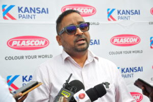 Plascon Uganda Managing Director Santosh Gumte addressing media