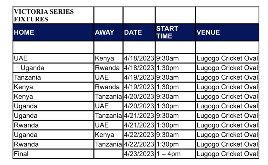The tournament will be played in a round robin format and start on Tuesday 18th April 2023 at the Lugogo Cricket Oval with two games each day until Saturday 22nd April 2023.